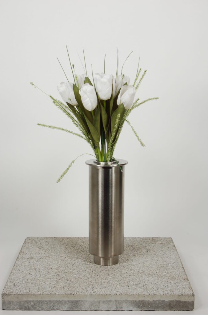 Aus Edelstahl gefertigte „moderne runde Grabvase“ mit geschliffener, passivierter und geölter Oberfläche. Mit Edelstahlvaseneinsatz und zur Befestigung am Sockelstein, mittels mitgelieferten Montageschrauben, vorbereitet.