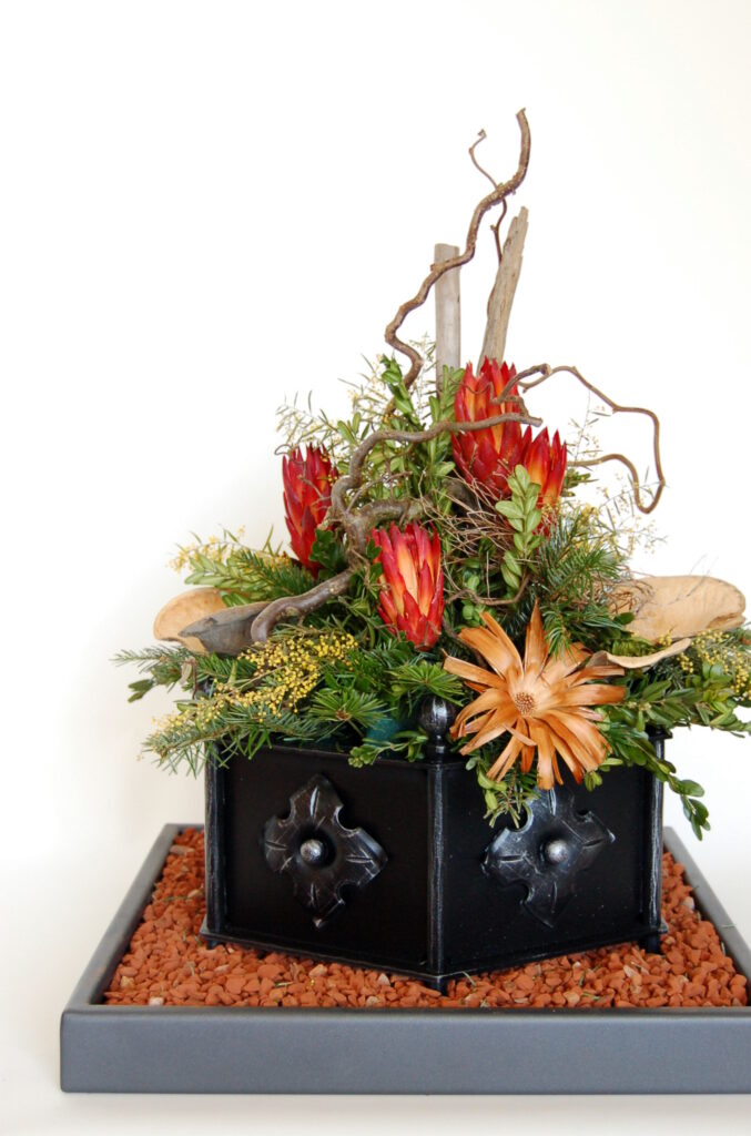 Blumenschale aus Stahl geschmiedet, Oberfläche verzinkt, grundiert und lackiert. Mit Montagematerial und Kunststoffeinsatz.