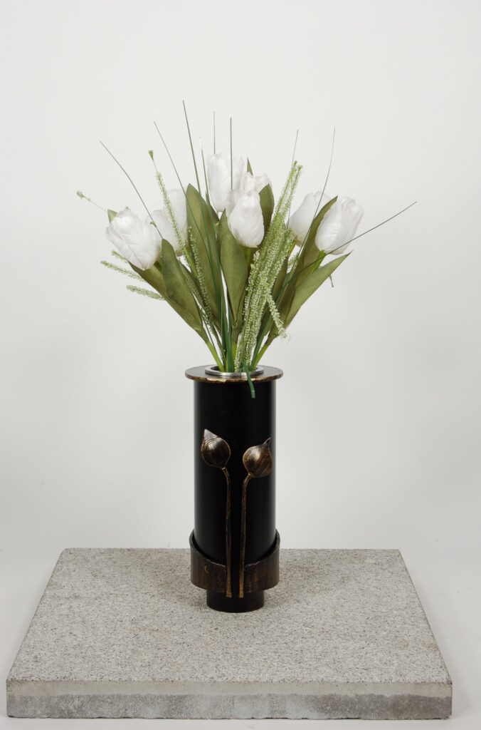 Aus Edelstahl rund gefertigte „florale Grabvase“ mit Edelstahlvaseneinsatz. Die Oberfläche ist grundiert, schwarz matt lackiert und kann in Bronze-, Silber- oder Grünspanpatina aufgewertet werden. Zur Befestigung am Sockelstein, mittels mitgelieferten Montageschrauben, vorbereitet.