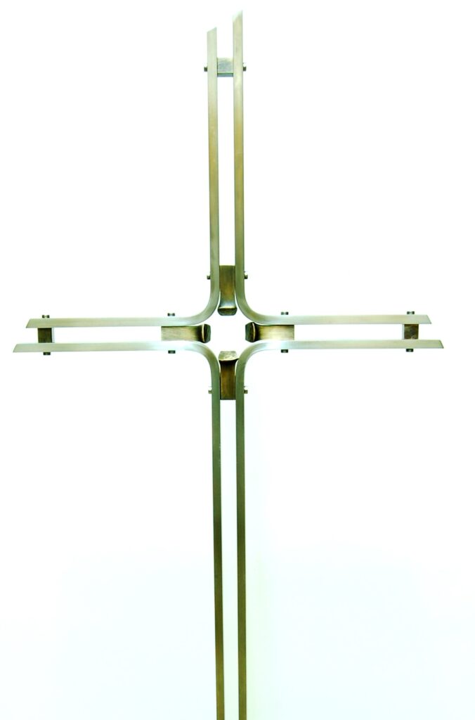 Das Grabzeichen ist aus parallel laufenden Edelstahlmaterialien gefertigt. Dazwischen sitzen Distanzen aus Edelstahl oder Bronze. Die Oberfläche ist geschliffen, passiviert und geölt. Zur Befestigung am Sockelstein sind Montagezapfen (M12x140mm) vorbereitet.