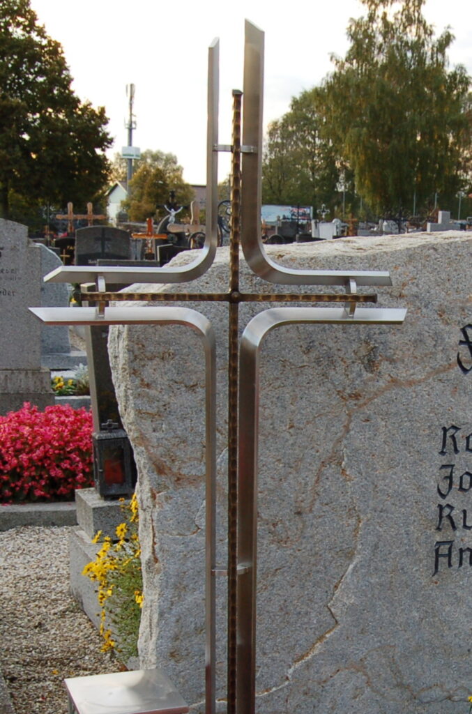 Rahmenkreuz aus Edelstahlflachmaterial gefertigt, mit geschliffener, passivierter und geölter Oberfläche. Zentralkreuz aus Bronze geschmiedet, patiniert und konserviert.